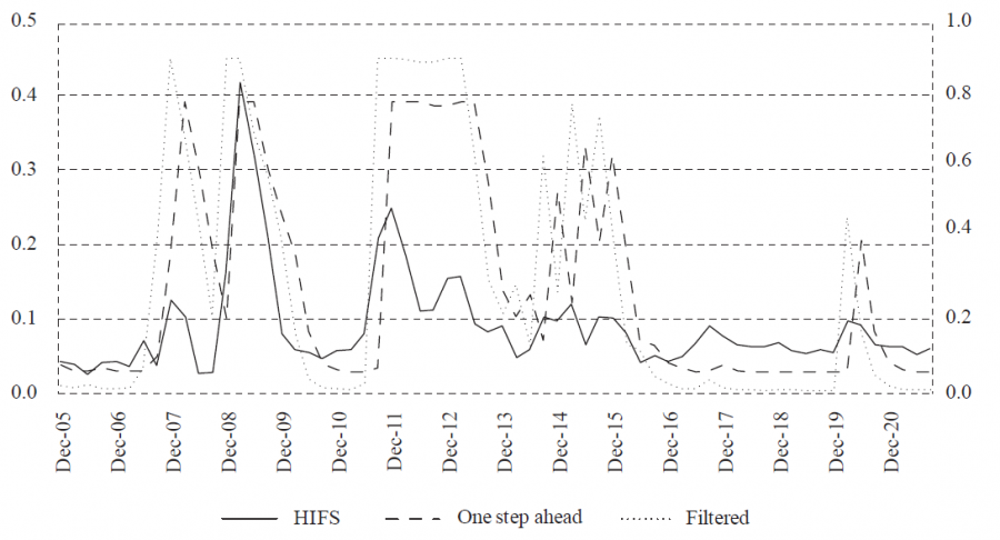6 Calculation of HIFS is based on volatilities and similar measures and correlations derived from daily data on bond yields, stock market returns, money market interest rates, exchange rates, and interbank market rates and fragility. It does not include any of the individual indicators (or their transformations) used in MRS modelling.