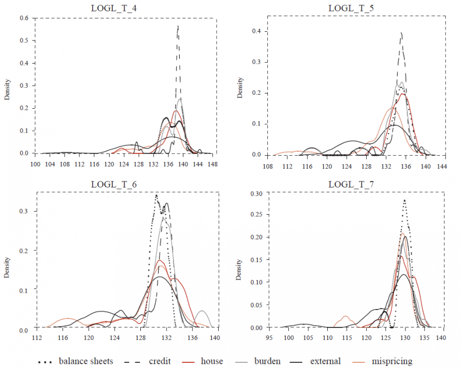 However, previous analysis observes the entire distribution performance of each category. In the next step, we observe those individual indicators that are useful in transition probability forecasting (equation (3)). We extract those indicators that have significant parameters in equation (3) and that are positive, indicating that greater values of those indicators affect the future probability of staying within the stressful regime or entering it. Put differently, when estimating the regime-switching model, the matrix in (2) includes the estimation of the parameter that is related to entering the regime of higher stress if the DGP was in the lower stress regime in the previous period. Furthermore, the matrix includes the parameter related to staying in the regime of higher stress if the DGP was previously in the same regime in the previous period. These parameters are depicted in table 3. The left panel in table 3 shows the value of the estimated parameters from equation (3) for the case of entering the higher risk from the lower risk regime for all four types of lags: t-4 to t-7. The right panel in table 3 contains values of the parameters regarding the case of staying in the higher risk regime. As the indicator variables are in different units of measurement, they are not directly comparable. The values are shown so that the dynamics of the parameter value can be observed. The dynamics are stable across all individual variables in the left panel in table 3. In contrast, an increasing trend is found in the right panel of table 3 for some variables (e.g., credit and house price series). Stable dynamics indicate a stable effect of a variable in the model, which is needed for its credibility. Increasing dynamics of the parameter in the right panel in table 3 means that the effects of individual indicators on the probability of staying in higher stress regime increases as the lag gets smaller. Such a result is in line with previous early warning system research 11 that concludes that the best-performing signalling indicators increase their values the most several quarters before the crisis hits. In the context of regime-switching, this could be interpreted as the persistence in those indicators accumulating the total effects for the future transition probability.