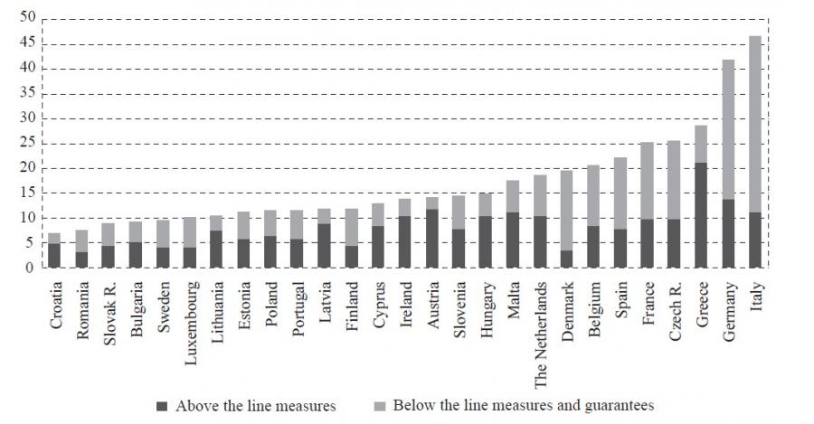 Fiscal policy has taken centre stage in stabilizing economies hit by the pandemic shock in 2020 and 2021. Most governments responded to the disruptions caused by Covid-19 with various above-the-line measures (e.g., large expansion of health-related and other public expenditures and revenue deferrals), directly affecting economic activity via fiscal multipliers, and with below-the-line measures (e.g., equity injections, liquidity loans, debt assumptions) and guarantees, whose economic impact depended on how much they have been taken up and spent by targeted recipients. With respect to EU countries, total fiscal support to the economy from the beginning of the pandemic has ranged from around 7% of GDP in Croatia to above 45% in Italy (figure 1). If one focuses only on direct, above-the-line measures, these figures still indicate heavy fiscal support, ranging from 3.5% of GDP in Denmark to above 20% in Greece.