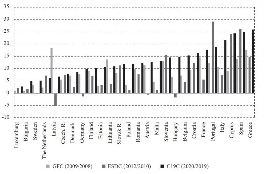 Although discretionary fiscal measures and automatic stabilizers cushioned the adverse economic effects of the Covid-19 shock, they have also led to a sharp increase in public debt, in both absolute and relative terms. Figure 2 shows that in most European countries the increase in public debt in 2020 was much more intense than during the GFC in 2008-09 or the sovereign debt crisis in 2010-12, due to both stronger fiscal reaction and a more substantial fall in GDP. The pandemic has also put intense pressures on healthcare systems around Europe, revealing many structural deficiencies and putting an additional burden on mid-term fiscal sustainability (OECD, 2020).