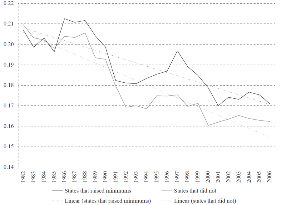 Figure 3 shows that the traffic fatality rate typically fell over time, but it fell significantly more in states that did not raise their auto insurance minimums than in those that did. The difference between the two groups’ fatality rate means is statistically significant at the 5 percent level. As can be seen in the figure, the gap in traffic fatalities between the two groups of states widened more in the second half of the 1982-2006 period when several states increased their auto insurance minimums. Of course, this figure does not prove that lower auto insurance minimums cause an improvement in safety by reducing the moral hazard effect. In fact, one could argue that causality might work in the opposite direction: rising traffic fatalities may force policymakers to update their auto insurance minimums. However, we don’t find any evidence in favour of the reverse-causality argument.