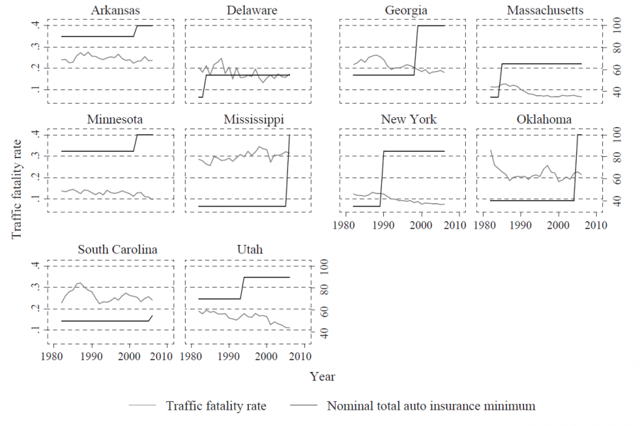 The empirical challenge of detecting the moral hazard effect requires separating the trend of declining traffic fatalities due to continual improvements in road and vehicle safety from policy-induced changes such as the increase in auto insurance minimums. Fortunately, policy-induced changes in auto insurance minimums that occurred in ten states during the studied time period can serve as a quasi-experiment, helping with the identification of the causal effect from policy changes. Namely, if there is a moral hazard effect, then the states that raised their auto insurance minimums should have experienced a higher traffic fatality rate than the control group, ceteris paribus.