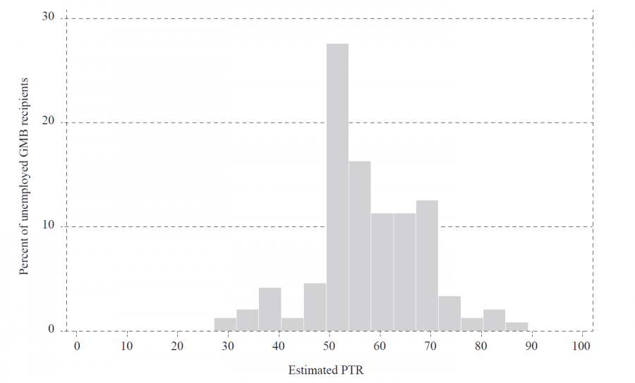 Graph 3Histogram of GMB-related benefits and social transfers including child benefits DISPLAY Graph With respect to the household structure, about half of the new beneficiaries belong to household types supposedly characterised by the inactivity trap: single-parent households and households with two or more adults with dependents 9. Yet about a third of new unemployed GMB beneficiaries resided in a single-person household, and about one fifth recipients were living in a multiple-person household without dependants 10, supposedly facing considerably lower PTR as barrier to employment. However, the average calculated PTR for taking up a minimumwage job based on household structure and benefit levels of cohort observed resulted in PTR estimates within a 9 percentage point range: the lowest for singleperson household (52%), and the highest for household with dependants (61% – yet much lower than 102% in TBID). Therefore, we will turn our analytical focus toward the calculated level of PTR as a direct indicator of work disincentive.