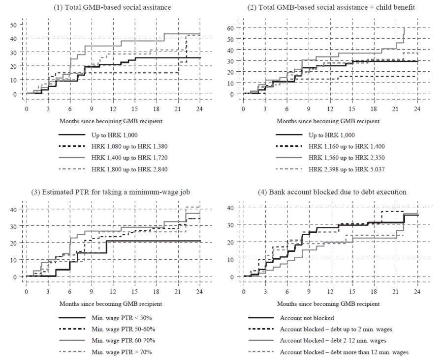 This is significantly less than 55% of employed within 12 months among all who entered unemployment in the 2012-2014 period (Lucić, forthcoming). Within two years, the share had increased to 34%, indicating a decline of the hazard rate for transition towards employment, yet no isolation from the labour market 11. However, when the employment of any household member is observed as an outcome (effectively ending the GMB episode), then transitions stand at 36% within a year and 47% within two years.