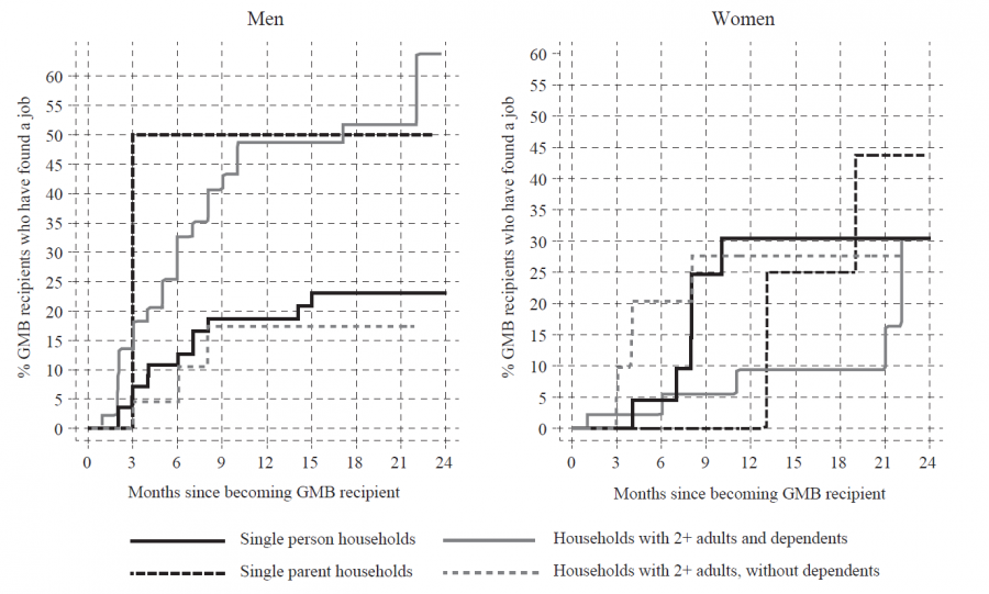 Employment of men and women in GMB follows different patterns, depending on household type and their family role (graph 8). Male GMB recipients are more likely to make the transition to employment when there are dependants in the household. It is exactly these configurations in which female GMB recipients have very weak chances for employment during first twelve months. Yet female employment performance is similar to that of men when there are no other dependants in the household. Such patterns are in line with traditional gendered specialisation within the family, and the substitution of in-household work for labour supply for unemployed female GMB recipients, consistent with care responsibility hypothesis.