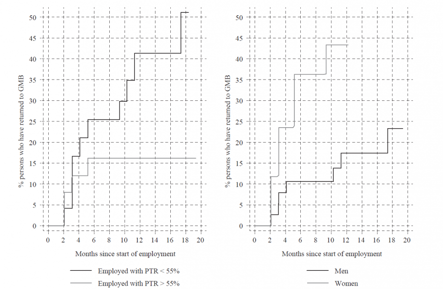 Graph 10Kaplan-Meier failure function: relapse from employment into GMB DISPLAY Graph While the number of observations was insufficient for application of more sophisticated model, we have compared patterns of relapse with respect to gender and effective PTR of employment (based on wage and prior benefit level). It seems that women are more likely to relapse into GMB than men, while persons who faced above-average PTR when entering employment (for whom work paid off to lesser extent) were less likely to return to GMB (graph 11). This warrants more research.