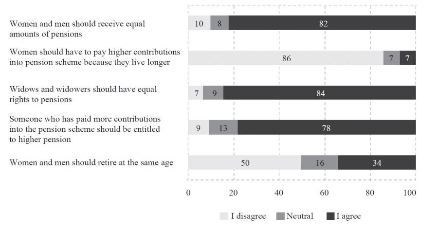 However, if we analyse the pension system reform changes that might affect the position of women, we notice an inconsistency in the responses (figure 1). On the one hand, the obtained responses that are gender-sensitive are in line with the previous statement. For example, only 7% of respondents agreed with the statement that “women should pay more into the pension system because they live longer”, while 84% agreed with the statement that “both widows and widowers should have equal rights to pensions”. On the other hand, the attitudes of respondents that contain a certain trade-off show a discrepancy with the willingness to eliminate the gender differences in pensions. The statement that “someone who has paid more contributions into the pension scheme should be entitled to higher pension” received 78% positive responses. This change could lead to an increase in the GGP (i.e., tighter linking of the amount of pensions with the amount of paid contributions). However, the statement “that women and men should retire at the same age” received only 34% of positive responses even though this change could lead to narrowing of the GGP.