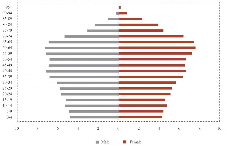 The current age-sex pyramid shown in chart 1 is of the constrictive type. This type is generally characterized by low fertility, low mortality, long life expectancy and an overall aging population (Saroha, 2018). In the current pyramid, these features can be observed, with special emphasis on the significant number of the mature population.