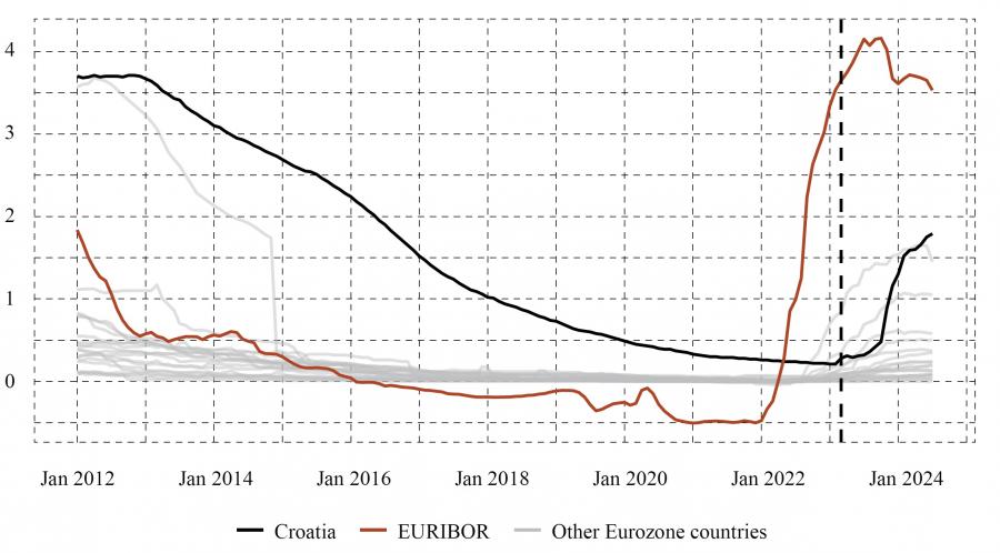 With Croatia joining the euro area, the previously limited transmission mechanism of interest rates should now have a more substantial effect on bank behaviour. However, since Croatia joined the euro zone fairly recently, delays and obstacles in its functioning are possible.