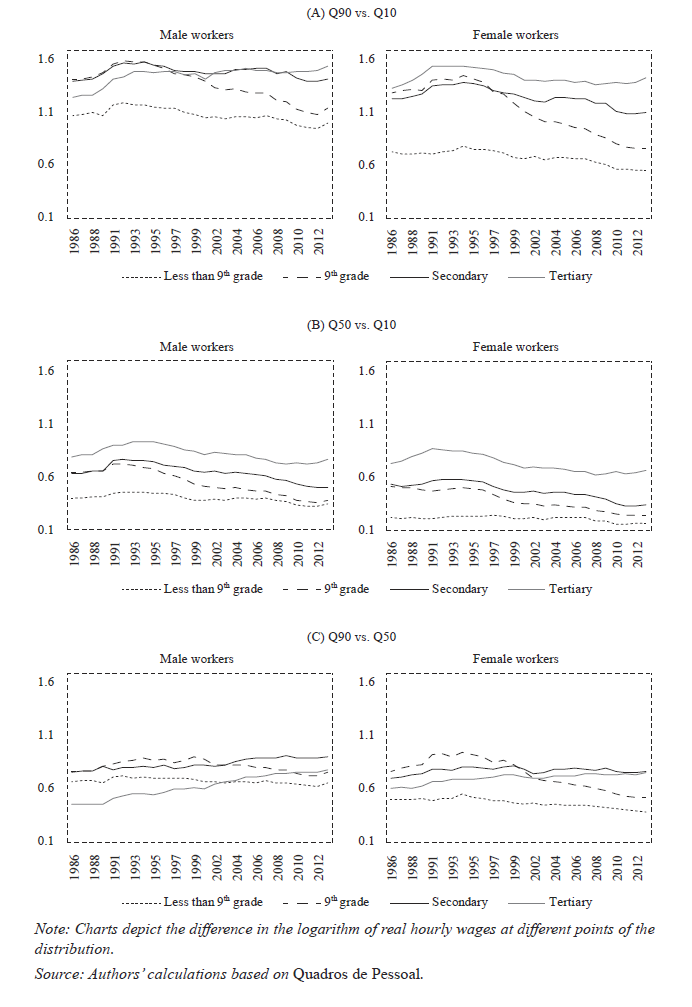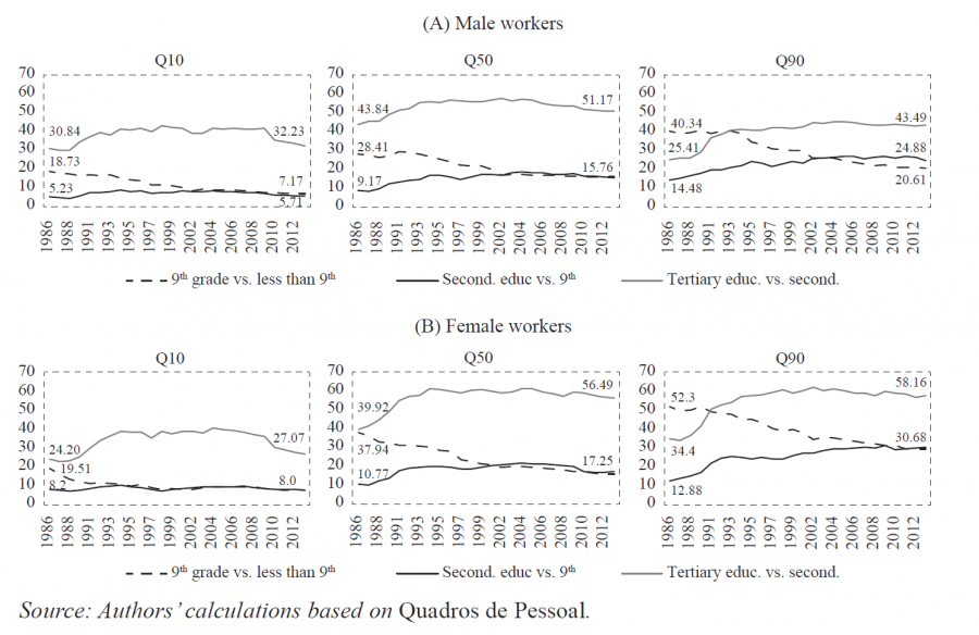 Focusing on workers with lower educational levels, figure 5 also points out that while in the late 1980s wages of individuals who did not complete the 9th grade were considerably below those of workers who did, this difference almost disappears in more recent QP waves. Conversely, whereas in the beginning of the period average real wages were similar among workers with 9th grade education and those who have completed secondary schooling, the gap between the two groups has been widening since the 1990s.