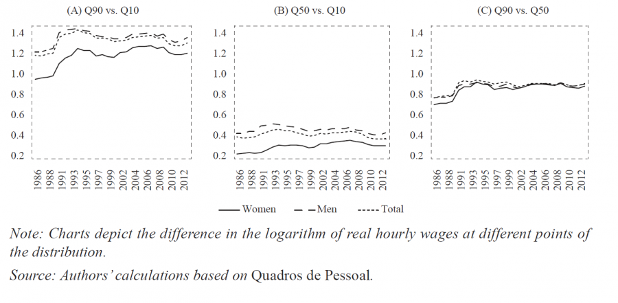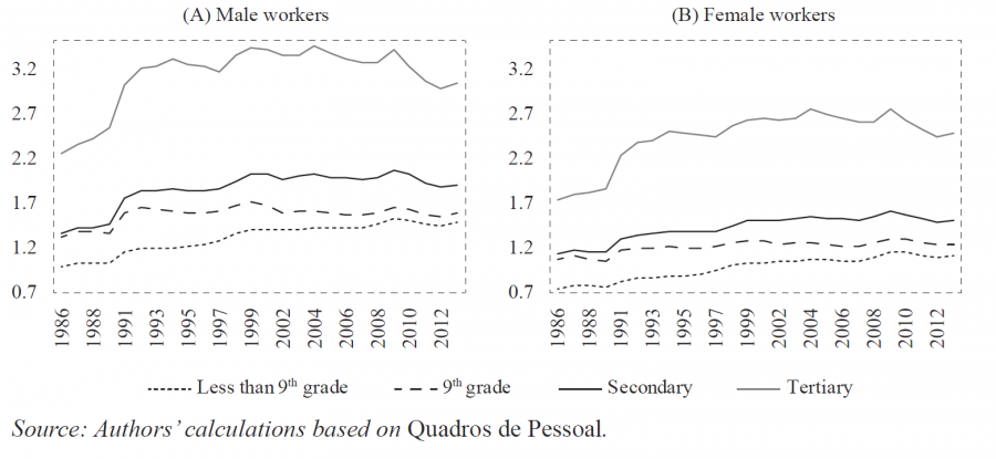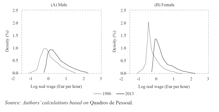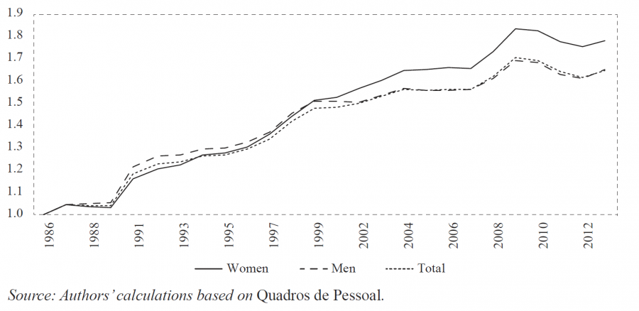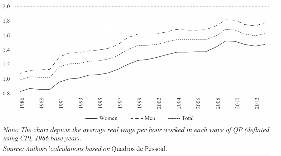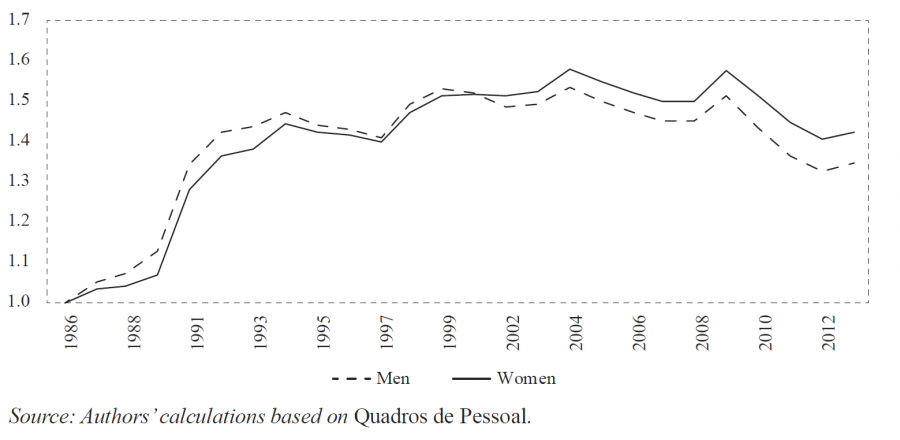 In spite of their better educational endowments, QP data show that, on average, women earn consistently lower wages than male employees over the whole period (figure 2). Nonetheless, although the two genders have experienced similar real wage increases in the first part of the 1986-2013 period, women’s earnings have been growing more sharply than men’s since 2000 (figure 3). As emphasized in Cardoso et al. (2016), this evolution may be explained by a composition effect stemming from the higher educational level of the women joining the labor market. Indeed, on average, wages for university-educated women, who represent an increasing share of our sample, grew more than wages of males with the same educational level (figure 4).