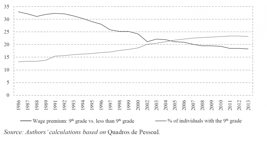 However, even older individuals who were still attending school in 1986 may have anticipated that the market would start valuing completion of the 9th grade and decided to study longer – either to complete just the 9th grade or further levels to obtain a differentiation factor. This would result in a decline in the share of individuals with less than the 9th grade even before the first cohorts affected by the legal change joined the labor force. Although it is not possible to establish a causal link between this decline and the drop in returns to the 9th grade, ceteris paribus, an expansion in the pool of workers who have completed the latter level would in principle result in such an evolution. This suggests that the drop in the premium for completing the 9th grade was supply-driven. Additionally, this evolution may have been reinforced by selection effects. In particular, it is arguable that the individuals who drop out after completing the 9th grade in the recent period differ from those who did it some years or decades ago, in terms of characteristics that may result in lower returns to schooling (for example, younger 9th grade drop-outs may be expected to have, on average, poorer innate ability endowments, or less favorable family backgrounds).
