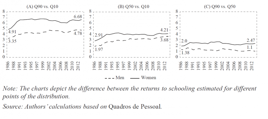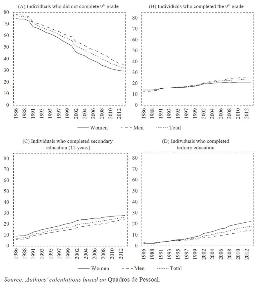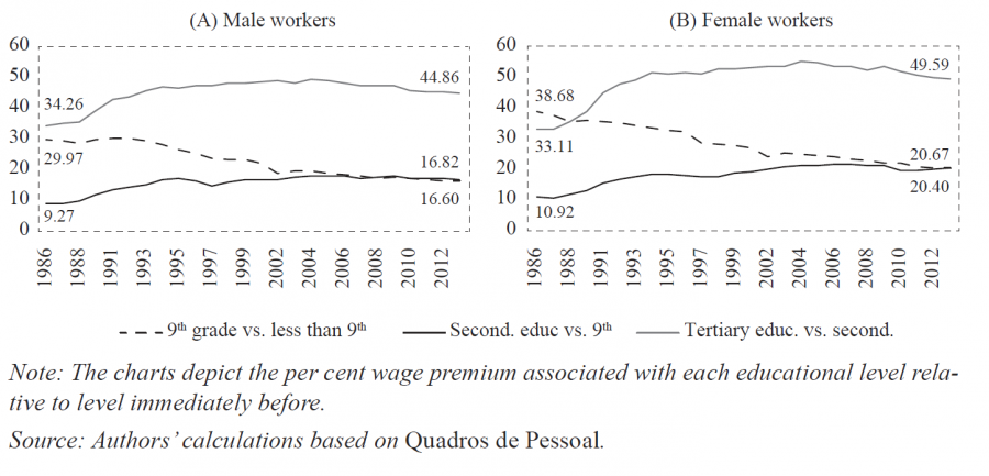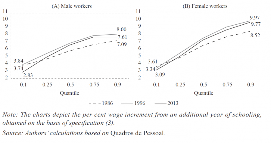 Regarding secondary education, there is evidence that the gain relative to completing only the 9th grade increased along the 1986-2013 period, but it is still considerably below that referring to tertiary education: 16.8 per cent for men and 20.4 per cent for women. The increase in the premia estimated for secondary and tertiary education occurred against a background of an expansion in the pool of workers holding these schooling levels, suggesting that it may have been demanddriven.