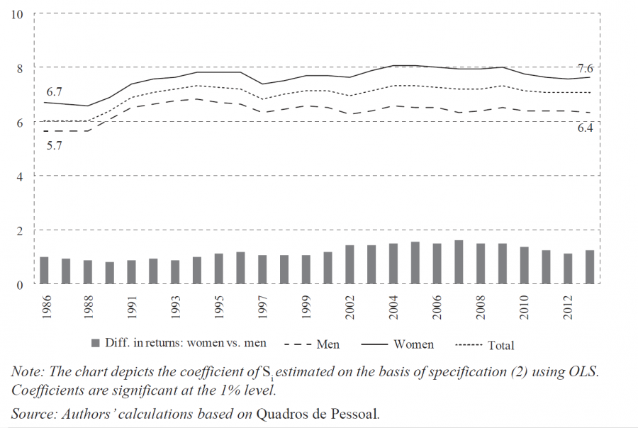 The results provide evidence of positive returns to an additional year of schooling in the case of both men and women. In the latter, the estimated returns are slightly higher, over the whole period under analysis: in 2013, an additional year of schooling is estimated to yield, on average, a 7.6 per cent increase in females’ hourly wage, whereas for men the estimated increment stands at 6.4 per cent. The gender gap in the returns is statistically significant along the entire period and has remained relatively stable since 1986. Over time, there has been a slight increase in the returns for both genders. This was particularly marked along the 1990s and in more recent decades the returns remained relatively constant, albeit with a minor drop as of 2009.3