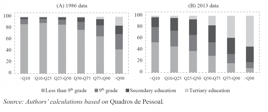 The educational composition of individuals across the distribution changed considerably along the 1986-2013 period. While in 1986 the share of workers with tertiary (or even secondary) educational attainment with below-median wages was low, it increases when focusing on the 2013 wave of QP (figure 6). Although this may reflect a wide range of aspects and changes in the composition of private employment or in the productive structure of the economy, it can also be interpreted as a symptom of over-education (a phenomenon that warrants further analysis but which is out of the scope of this paper).