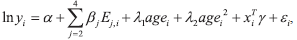 lnyi = α + βSi + λ1agei + λ2age2i + xiTγ + εi (2)