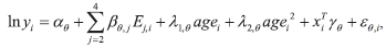 lnyi = αθ + βθSi + λ1,θ agei + λ2,θ agei2 + xTi γθ + εθ,i,(3)