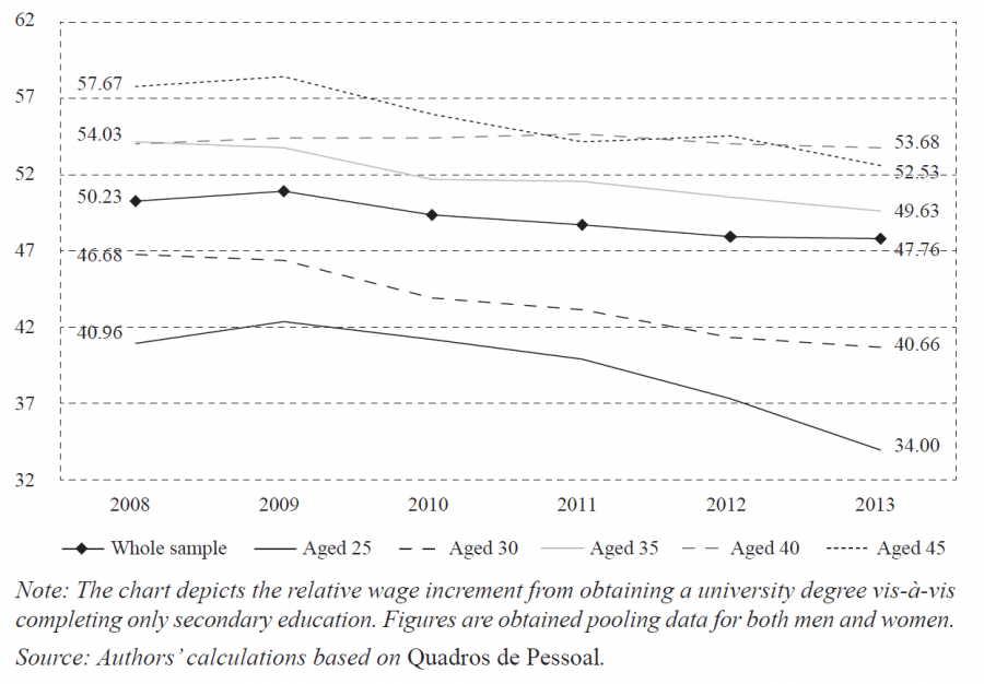 Alves, Venteno and Novo (2010), and Portugal (2004) provide estimates of the returns to tertiary education. In both cases, the authors find positive and significant returns benefiting individuals with university degrees (relative to non-university educated counterparts). Alves, Venteno and Novo (2010) provide estimates of the tertiary education wage premium at different points of the distribution and on the basis of QP data for 1982, 1995 and 2006. In the latter year they find returns ranging from approximately 45 per cent to almost 100 per cent, respectively, at the lower and upper quantiles of the distribution.