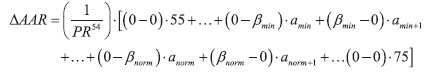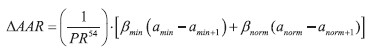 Assuming the same model as described by (A3) above, the effect of a reform to increase statutory retirement ages by one year will be: firstly, to increase participation at the (pre-reform) minimum age of retirement by -βmin so that ΔPRmin = -βmin; and secondly, participation increases by -βnorm at the (pre-reform) normal age of retirement, so that ΔPRnorm = -βnorm. The participation rate at all other ages remains unchanged, so that ΔPRa = 0 for all a ≠ amin or anorm. Substituting into (A7) the change in AAR, as a result of the reform, is given by: