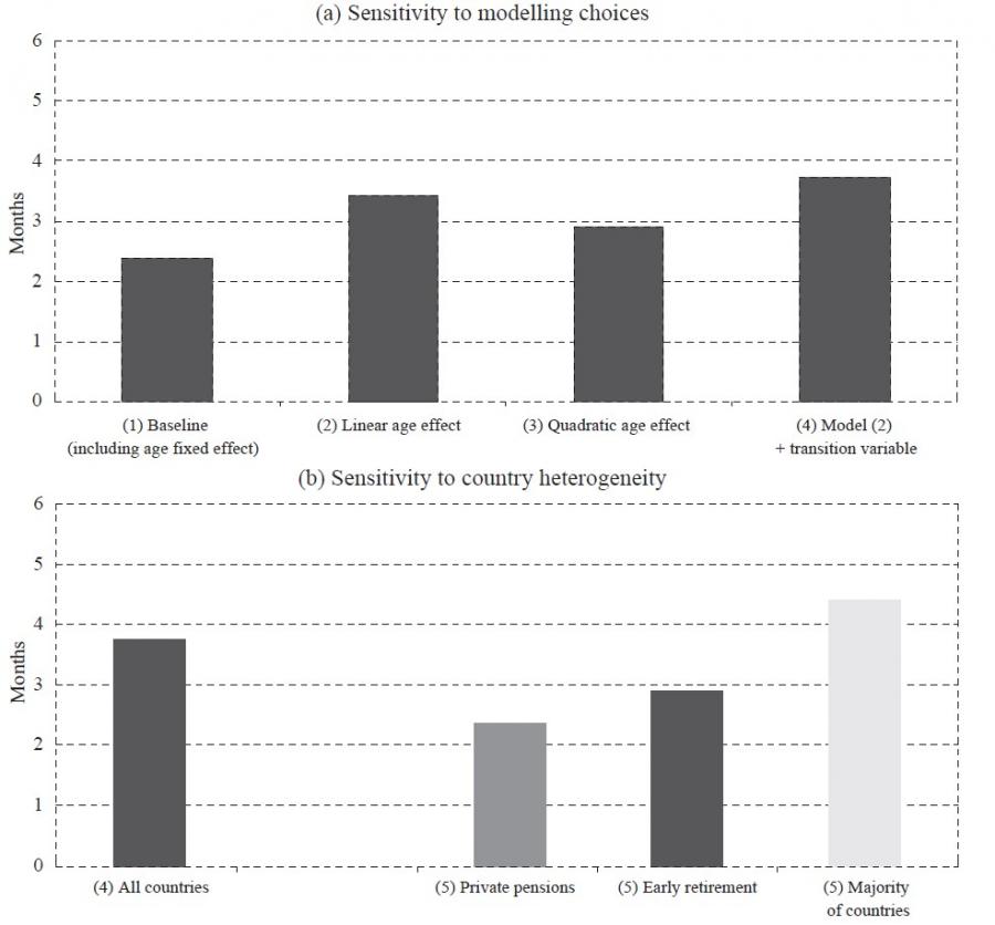 In summary, the results from cross-country panel regressions consistently imply that the statutory retirement age has only a rather modest effect on the average effective retirement age, which would seem to be at odds with the importance usually given to pension reforms. These findings of modest effects also seems to be contradicted by quantifications based on pension reforms in individual countries. Siebold (2019) analyses the concentration of retirements around statutory ages in Germany and concludes that “an increase in the normal retirement age from 65 to 66 is predicted to lead to an increase in average actual retirement ages by 4 months”. Mastrobuoni ( 2009) discusses a policy change in the United States that increased the normal age of retirement from 65 to 67 and raised the penalty for claiming retirement benefits before then, concluding that an increase in the normal retirement age by 2 months delays effective retirement by around 1 month. Staubli and Zweimüller ( 2013) analyse pension reforms in Austria that increased the early retirement age from 60 to 62 for men and from 55 to 58 for women, concluding that this increased employment by 10 percentage points among affected men and by 11 percentage points among affected women.