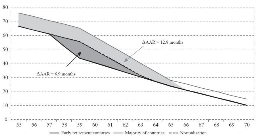 2 The normal retirement age is defined as the age at which an individual who entered the labour market at age 25 and had a full career becomes eligible for a full pension from all mandatory pension schemes.