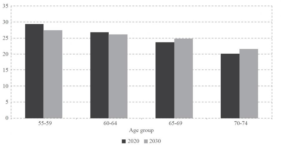 The assumption that the population is evenly distributed over the ages 55-74, is approximate for the typical OECD country and is likely to become an even better approximation over the next 10 years (figure A1).