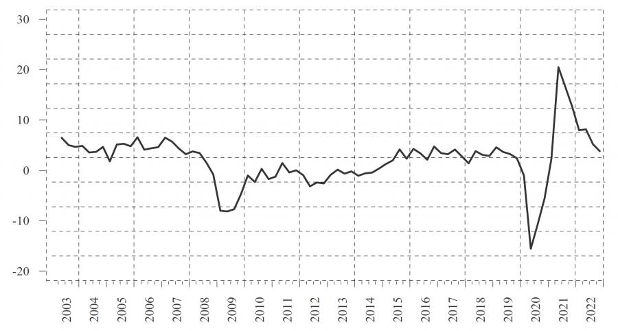 The second subperiod from Q4:2018 to Q2:2021 was characterised by low and stable inflation and the pandemic shock in 2020, which had huge macroeconomic and fiscal consequences. The government took large discretionary fiscal measures – tax write-offs, tax deferrals, transfers to compensate households and firms for income and revenue losses due to lockdowns – that led to sharp deterioration in public finances. The low and stable inflation in this period was thus inevitably associated with a large widening of the primary deficit. The primary deficit also increased, almost one-to-one, with the output gap. Fiscal policy was clearly not sustainable, as indicated by negative coefficients on lagged primary balance and debt to GDP ratios. Staehr, Tkacevs and Urke ( 2023) obtained similar results for 12 euro area countries covering this period.
