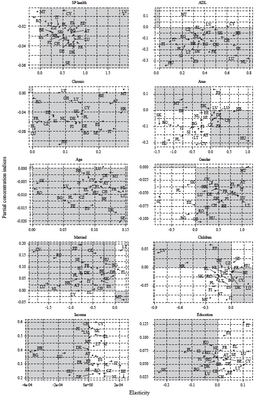 Contributions of factors in concentration index decomposition are presented in figures 2 and 3, and figures 4 and 5 show plots of corresponding elasticity and partial CIs. Negative contribution values indicate the pro-poor contribution of the relevant factor to the overall CI, while positive values present a pro-rich contribution. Figures 4 and 5 have areas shaded with different colors, white marking an area with pro-rich contributions (same sign) and grey areas marking pro-poor contributions (different sign).