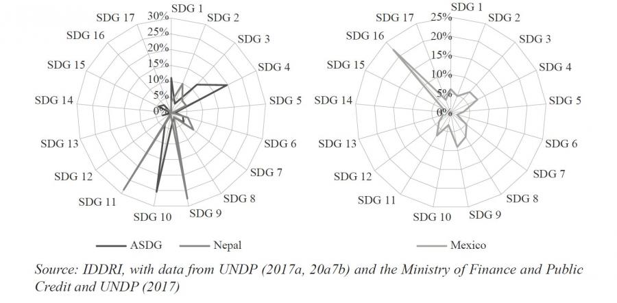Nepal and the Indian State of Assam have gone a step further, coding their budget according to the SDGs to keep track of the allocation of resources to each SDG goal (UNDP, 2017a; 2017b). These two entities have tracked SDG relevant resources at the budget line level. Figure 1 shows the results of this mapping.