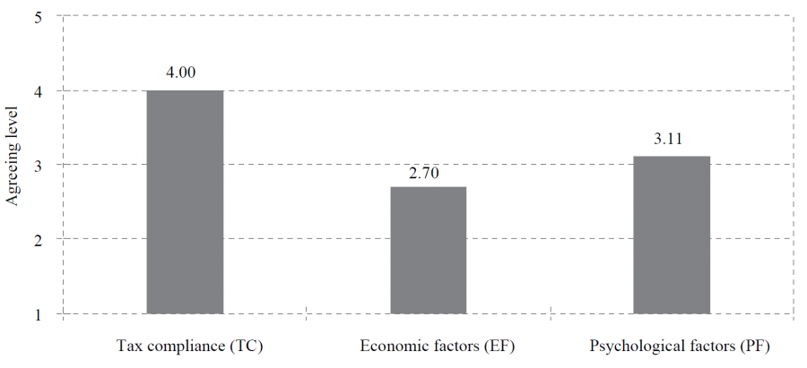 In graph 1 the mean response values between the tax compliance variable and economic and psychological variables are presented. The economic factor (EF) mean value was calculated by taking into account all answers on five economic variables. To calculate the psychological factor (PF) mean, all respondents’ answers on the 11 psychological variables were observed.