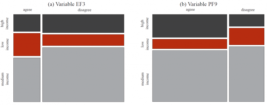 Table 6Chi-square test of independence, attitude on tax-related questions vs. gross income DISPLAY Table Graph 3Mosaic plots, attitude on tax-related questions vs. gross income DISPLAY Graph