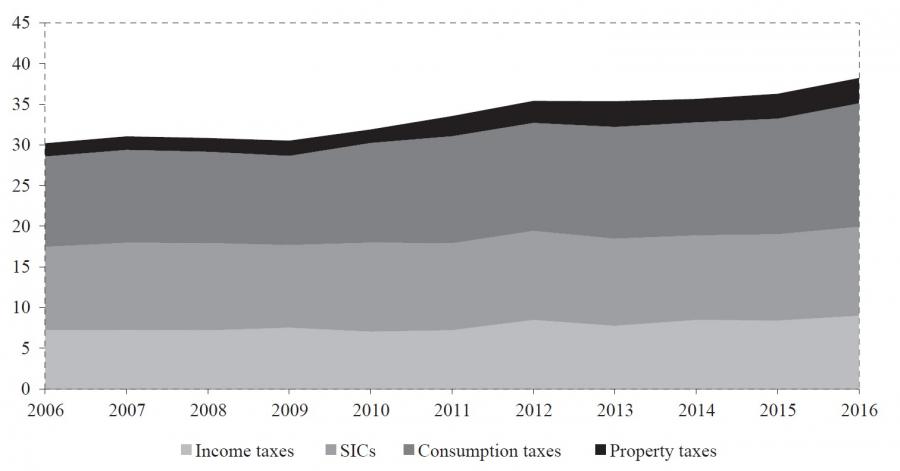 Graph 1Tax revenues share of GDP, Greece and EU28, 2006-2016 DISPLAY Graph Graph 2Taxes as shares of GDP, Greece, 2006-2016 DISPLAY Graph
