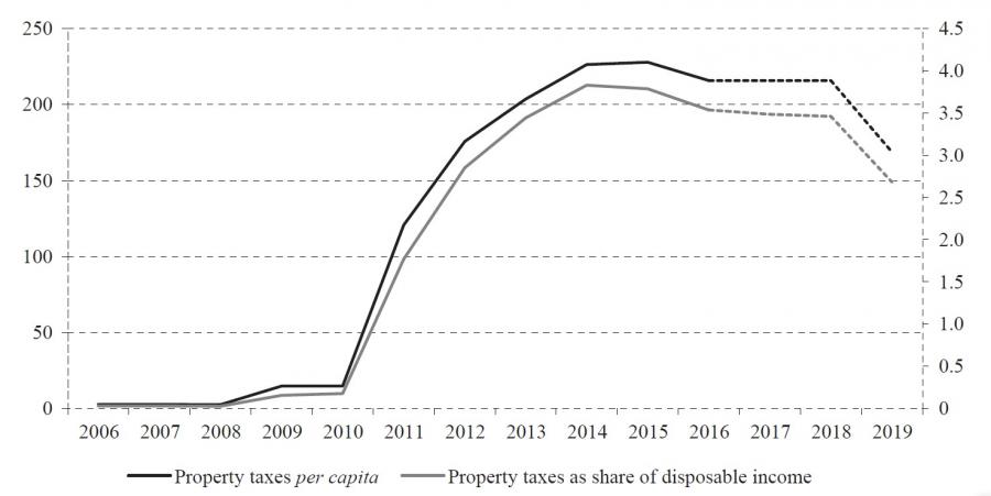 The recurrent taxes introduced in the period under consideration were assessed at the individual level and the tax base for the calculation of the tax was the taxable value of each asset. This, in turn, was determined mainly by the (administratively assessed) value of the geographical zone of the real estate asset. A major problem with the assessment of these taxes was that during the crisis property market values declined by over 40% (Bank of Greece, 2019: Table II.6), while their taxable values remained unchanged. The problem was further complicated because Greece lacks a complete cadastral registry and the re-assessment of detailed taxable values would have been a very hard exercise given the low number of transactions in the real estate market during the crisis. This is a usual drawback of real estate taxes in practice in many countries. As Almy ( 2014) points out, valuation practices frequently ignore revaluation requirements, which almost by definition occur in periods of rapid recession or growth. This lack of revaluation can enhance the perception of taxpayers that property taxes may be unfair. It should be noted that these taxes were introduced close to the peak of the Greek crisis. Output was down by 26%, the rate of unemployment was above 27%, while the disposable income of the average household was 42% below its peak (Andriopoulou et al., 2018). Unsurprisingly, the new tax was hugely unpopular and, according to many commentators, contributed to the downfall of the then government in the 2015 elections.