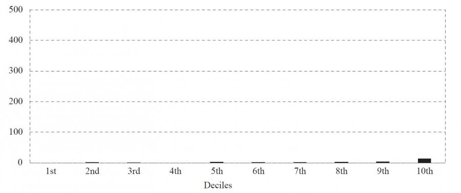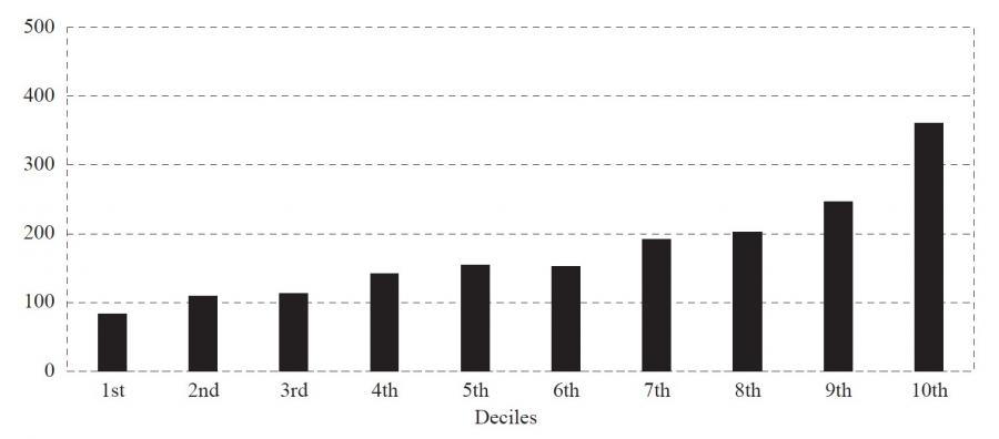 For the majority of the population these taxes were zero in 2007. Even for the richest decile, the annual figure per capita was below 15 euro. On the contrary, in 2012 and 2016 all deciles paid substantial amounts and the mean payment per decile rose continuously when moving from the poorest to the richest decile (with minor exceptions between the fifth and the sixth decile in 2012 and second and the third decile in 2016). Mean per capita payments ranged between 84 (113) euro for the bottom decile to 361 (420) euro for the top decile in 2012 (2016).