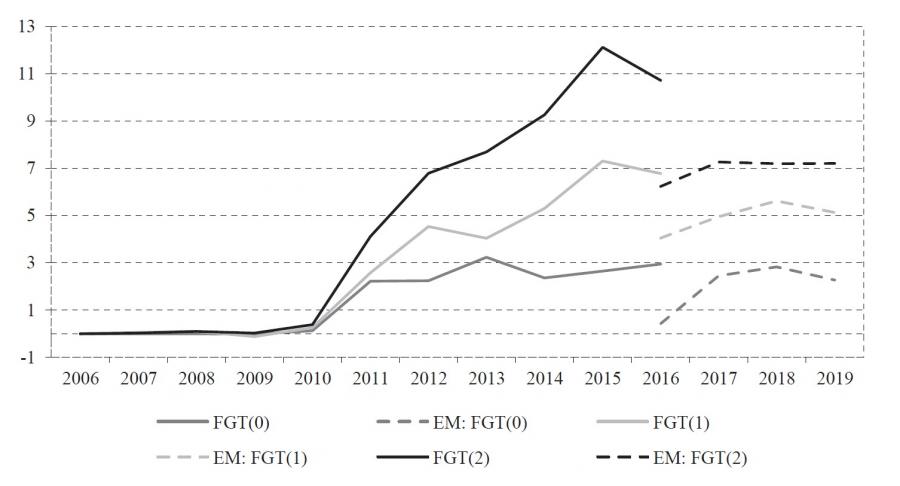 Finally, the effects of these taxes on relative poverty are assessed in Graph 13. For the purposes of this graph, the poverty line is not held constant but is always set at 60% of the median income of the corresponding income distribution. Three members of the parametric Foster-Greer-Thorbecke ( 1984) (FGT) family of poverty indices are exploited for the purposes of this graph: the headcount ratio, FGT(0), which measures the proportion of the population falling below the poverty line, but is not sensitive to the severity of their poverty; FGT(1), which is the product of the headcount ratio and the average poverty gap (distance between the poverty line and the mean income of the poor divided by the poverty line); and FGT(2), which measures the product of the head count ratio by the squared poverty gap and, thus, unlike FGT(0) and FGT(1) is sensitive to the distribution of income among the poor. The results reported in Graph 13 are largely similar to those of Graph 12. There are minimal changes in the indices until 2010. In most cases we see increasingly larger rises in relative poverty between 2011 and 2015 and a smaller increase between 2015 and 2016 (at least for FGT(2) whose value in 2015 increases by more than 12% as a result of recurrent property taxes - the pattern of the other two is not entirely clear). The higher the poverty-aversion parameter of the index, the larger the recorded proportional change in relative poverty. Changes in the estimates of the poverty indices in 2016 are lower when simulated data are used instead of the original SILC data. However, the simulations of EUROMOD suggest that unlike the changes recorded in inequality indices for the period 2016-2018, the poverty-increasing impact of recurrent property taxes rose during this period. For the last year under examination the poverty-increasing effect of property taxes declines according to FGT(0) and FGT(1) but remains stable according to FGT(2). Nevertheless, it is clear that the reforms in the field of recurrent property taxation in the years of the Economic Adjustment Programs increased relative poverty.