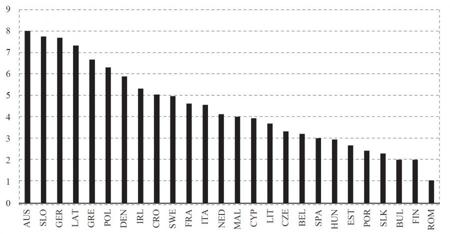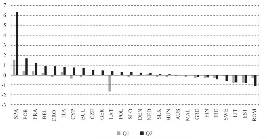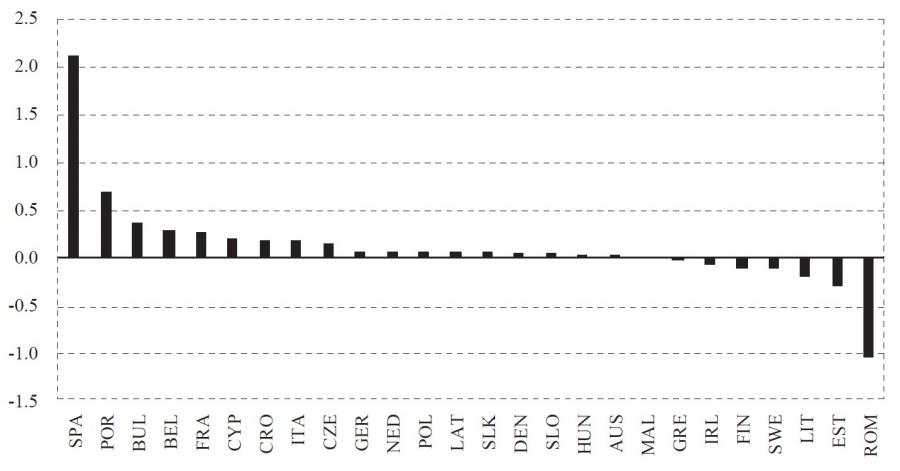 Results for equation (1) are presented in figure 1. Figure 1 shows the difference between estimated and actual values of change in the unemployment rate in EU-26 countries, where positive values indicate that the fiscal measures implemented do mitigate the increase of unemployment as compared to a situation in which no fiscal stimulus has been given. Negative values indicate that estimated values are lower than actual values, and therefore, the negative impact of fiscal policy measures on the change in the unemployment rate.