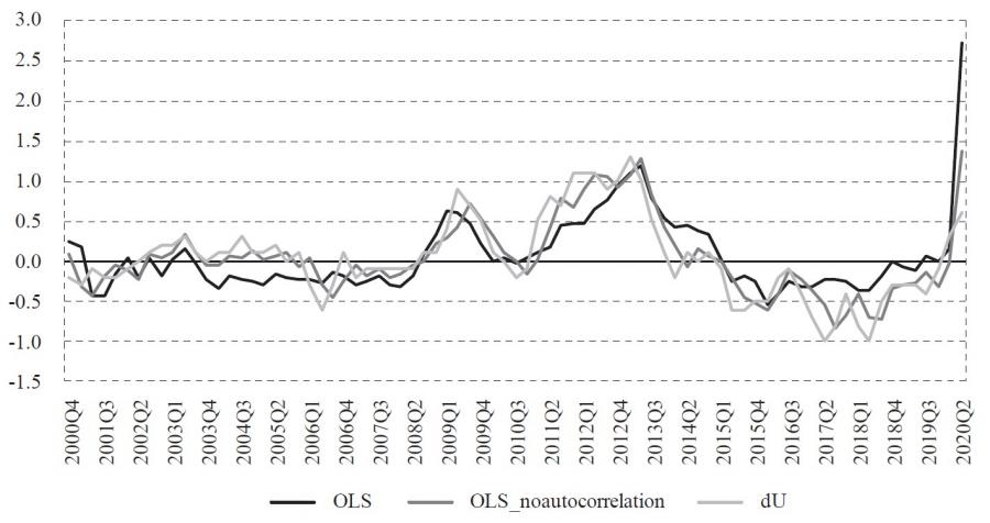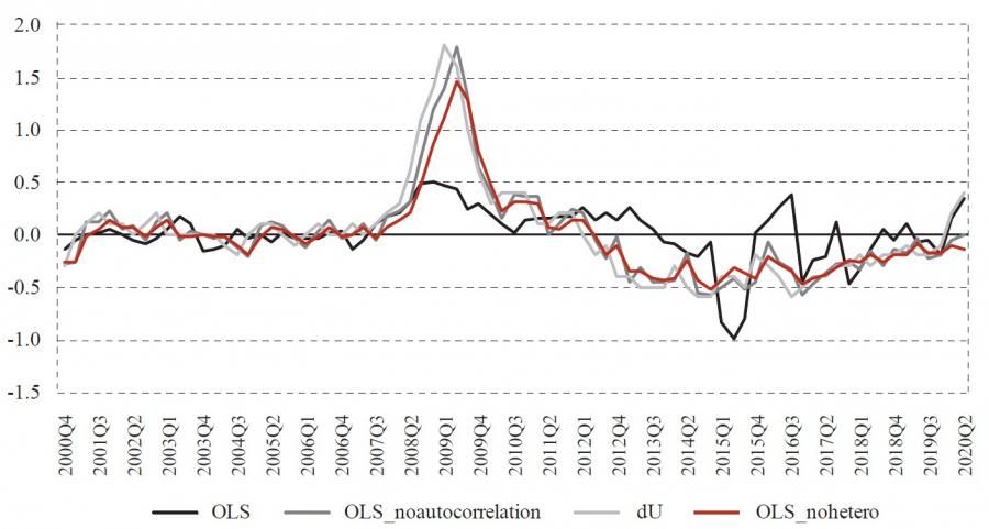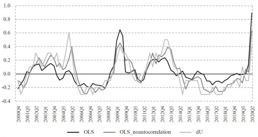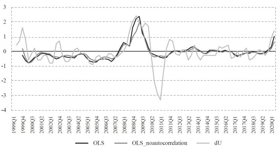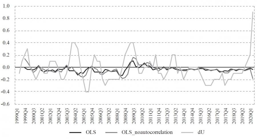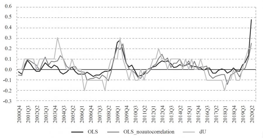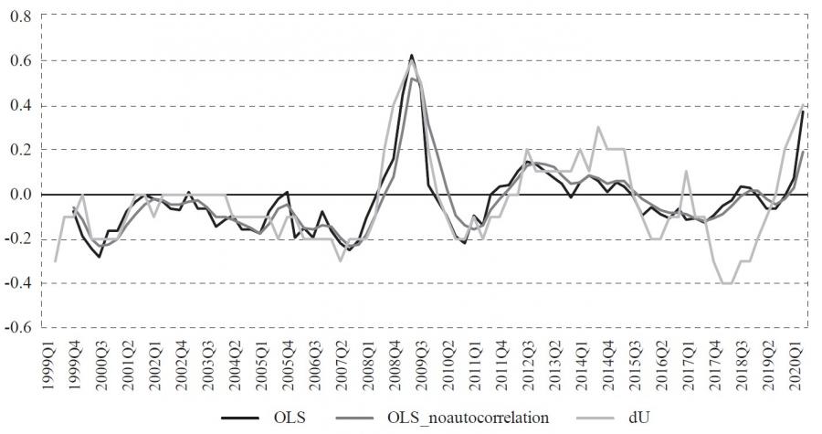 where ut – ut* = utc is a gap (cycle) between observed and potential unemploymentrate, yt – yt* = ytc is a gap (cycle) between observed and potential output. However, as Jovičić ( 2017) demonstrates, all commonly used methods of estimating potential output are particularly uncertain in real-time because estimates at the end of the sample can change significantly with the publication of new data, which is also called the end-of-sample problem. This property of potential output (or natural unemployment rate) estimates can result in significant revisions of current and historical potential output as new information throughout time arrives. Also, in periods of economic crisis when the future is completely uncertain, the difficulty of assessing potential output is especially pronounced. This uncertainty and potentially significant revisions are problematic because that information on the output gap is least certain at the very moment when it is most important to economic policymakers. This uncertainty can lead to unreliable estimates of the output gap that can result in wrong decisions and moves by monetary and fiscal authorities. Because of the mentioned problems, we will not estimate equation (2), and therefore, only the first approach is used in this paper. Also, we estimate equation (1) as of 2019:Q4, and then we forecast the unemployment rate level conditionally on the realized rates of change in GDP.