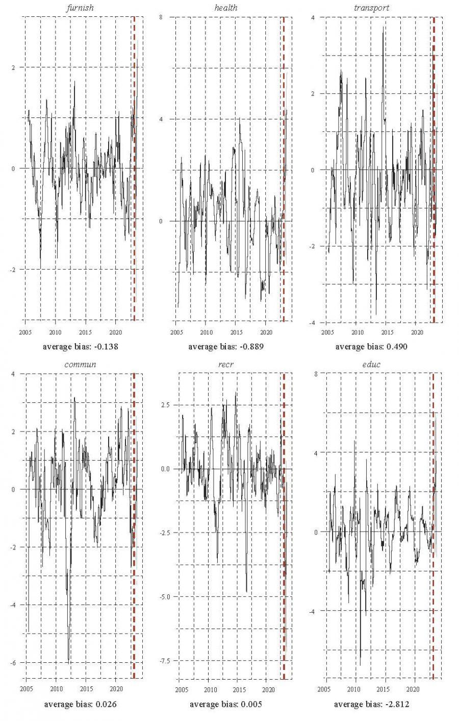 Table 6 reveals that the prices of coffee, wine, clothing, footwear, catering, restaurants and cafés, and accommodation have indeed reacted the most intensively to the euro changeover. However, the average biases reported in figure A2 suggest that most of lower-level ECOICOP inferences are to be taken with caution since the obtained fit is largely questionable. The official EU statistics hardly provides decent auxiliary covariates that are able to capture the dynamics of inflation at such low level of aggregation.