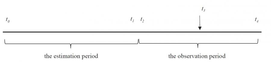 The chosen examination period is usually divided into two parts: the estimation period and the observation period. The estimation period is in general defined as the time from day t0 to day t1, while the observation period is defined from day t2 to t4 (Brown and Warner, 1985). Day 0 is marked with t3 on the timeline (figure 3).
