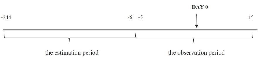 In our case, the estimation period is defined as the time from day -244 to day -6, while the observation period is defined from day -5 to day +5. The timeline is presented in figure 4.