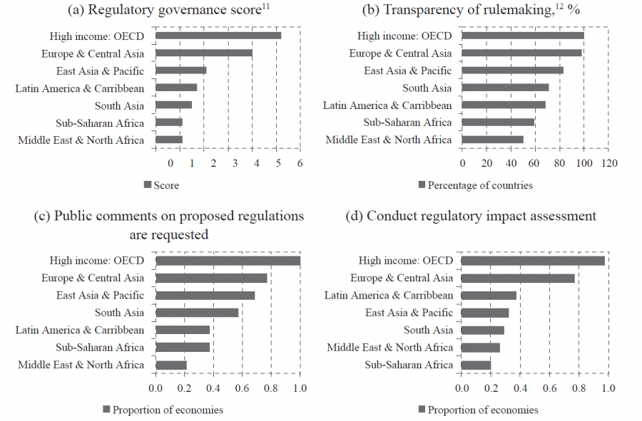 12 Transparency of rulemaking is one of the sub-indices of the Global Regulatory Governance Index. This subindex is concerned with whether regulators commonly communicate with the public about proposed regulations, and if so, how. Communication could be through unified websites where all (or substantially all) new regulations are posted before adoption, websites specific to particular ministries, public gazettes, federal journals or targeted outreach to specific stakeholders (World Bank, 2018).