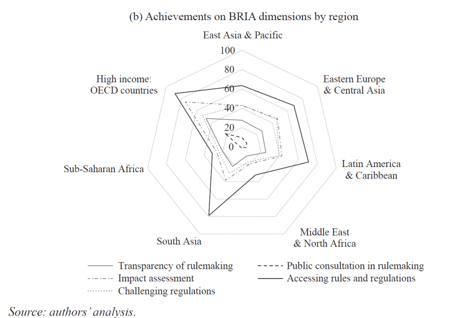 Compared to other regions, the rank of MENA comes at the end for the dimensions of consultation with the public, conducting impact assessment, and challenging regulations, while the region came second to lowest in two dimensions: transparency and accessing rules and regulations (figure A8b).