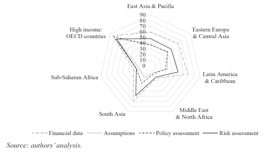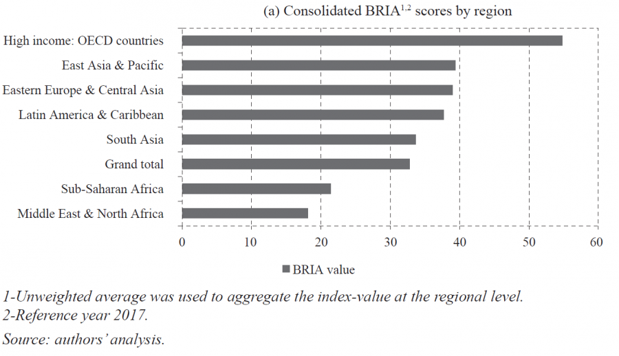 As figures A8a and b show, the BRIA performance varies among regions with observable discrepancies among the same region as demonstrated by table A4. It is observable that MENA is below the worldwide average in the global score of BRIA and in the five sub-indexes, with high discrepancy among its countries.