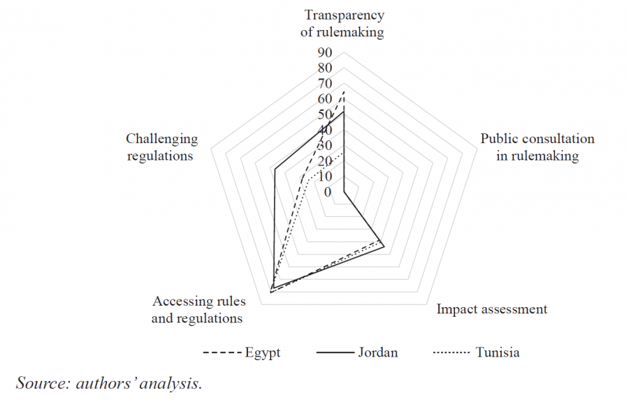 The three case studies vary in their performance related to RIA. Among the highest performers in MENA comes Tunisia (table A2). It stands out in three areas of RIA: transparency in law accessibility, openness for consultation to the public, and conducting impact assessment. Egypt and Jordan also provide access to the passed primary laws. In Egypt, this facility is protected by a paywall. Additionally, Jordan has higher score in openness with the public through prior consultation during the drafting stage.