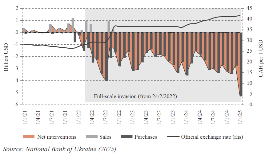 As can be seen in graph 1, with the war starting in February 2022, the framework was swiftly adjusted. The hryvnia was pegged to the US dollar at UAH 29.25/USD in late February to prevent capital flight and stabilise expectations. FX interventions became large and regular, but reserves increased markedly, primarily due to large-scale official external financing from international partners. At the same time, strict capital controls and cash market restrictions significantly curtailed private demand for foreign currency. As a result, foreign currency inflows systematically exceeded the amounts required to support the peg, allowing the NBU to accumulate reserves despite depreciation pressures.