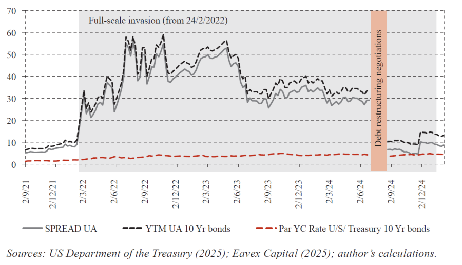 The 10-year bonds were chosen because they are the longest-maturity Ukrainian securities traded abroad. CDS spreads, often used in similar studies, were not used because the data after September 2022 are unreliable. US Treasury par yield-curve rates are assumed equivalent to yields to maturity.