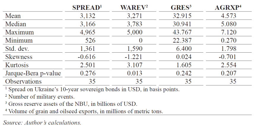 Existing studies have largely overlooked the influence of international reserves on sovereign bond spreads in a country experiencing active wartime conflict. This paper addresses that gap and offers novel insights into the FX market and sovereign debt dynamics of a major food commodity exporter navigating an unprecedented war environment. It examines the combined influence of the intensity of military actions, the volume of international reserves, and the dynamics of food commodity exports on external markets’ perception of Ukraine’s sovereign risk. A quantitative analysis of the relationship among these variables in the short- and long-term also sheds light on the effectiveness of the central bank’s efforts to maintain the cost of external borrowing under control in conditions of escalating physical attacks and disruptions to commodity export logistics. Another contribution of the paper is the use of an ARDL model to test several hypotheses related to the main research question. One advantage of this approach is that it can yield reliable results despite limited sample size.
