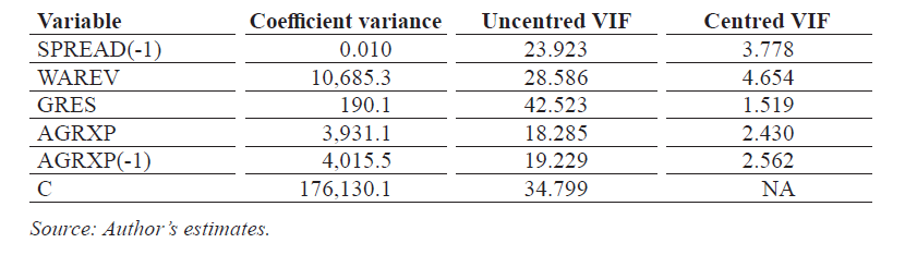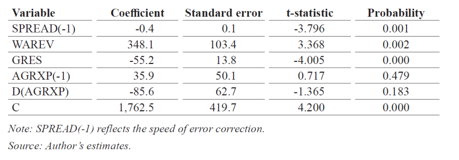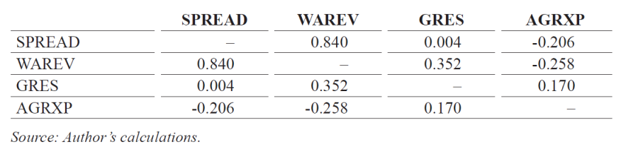 Estimation of the linear ARDL model was conducted with an unrestricted constant and no trend. During the automatic selection based on the Akaike information criterion, this limited the maximum number of lags for the dependent variable and regressors to three. After a preliminary evaluation of 192 variants (table A2), an ARDL(1,0,0,1) model was selected. Based on equation (4), this model can be expressed as follows: | SPREADt = α + β1SPREADt-1 + γ1,0 WAREVt + γ2,0GRESt + γ3,0 AGRXPt + γ3,1 AGRXPt-1 | (5) |