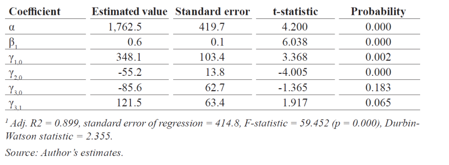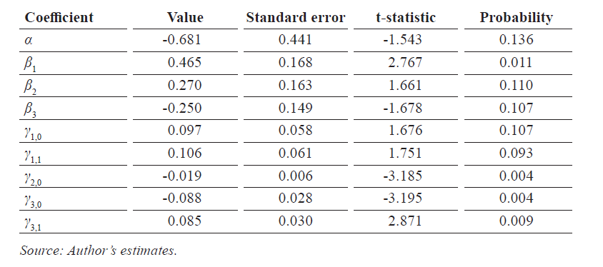 The bounds test refers to a model with three cointegrating variables (k=3) and an unrestricted constant (so-called case 3). The F-statistic of 6.381 exceeds the I(1) critical value at the 5% significance level for a sample of 35 observations, as per Narayan ( 2005). The t-statistic calculated from the same test, at -3.796, also suggests rejecting the null hypothesis at the 5% level. This provides sufficient evidence to indicate the existence a long-term cointegrating relationship among the model’s variables.