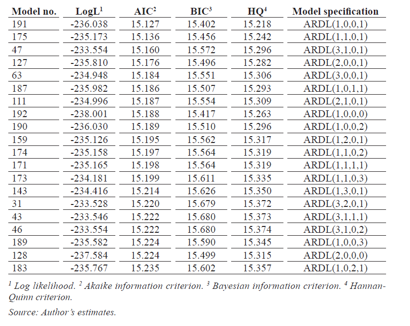 Table 8Conditional error correction model for ARDL (1,0,0,1) DISPLAY Table